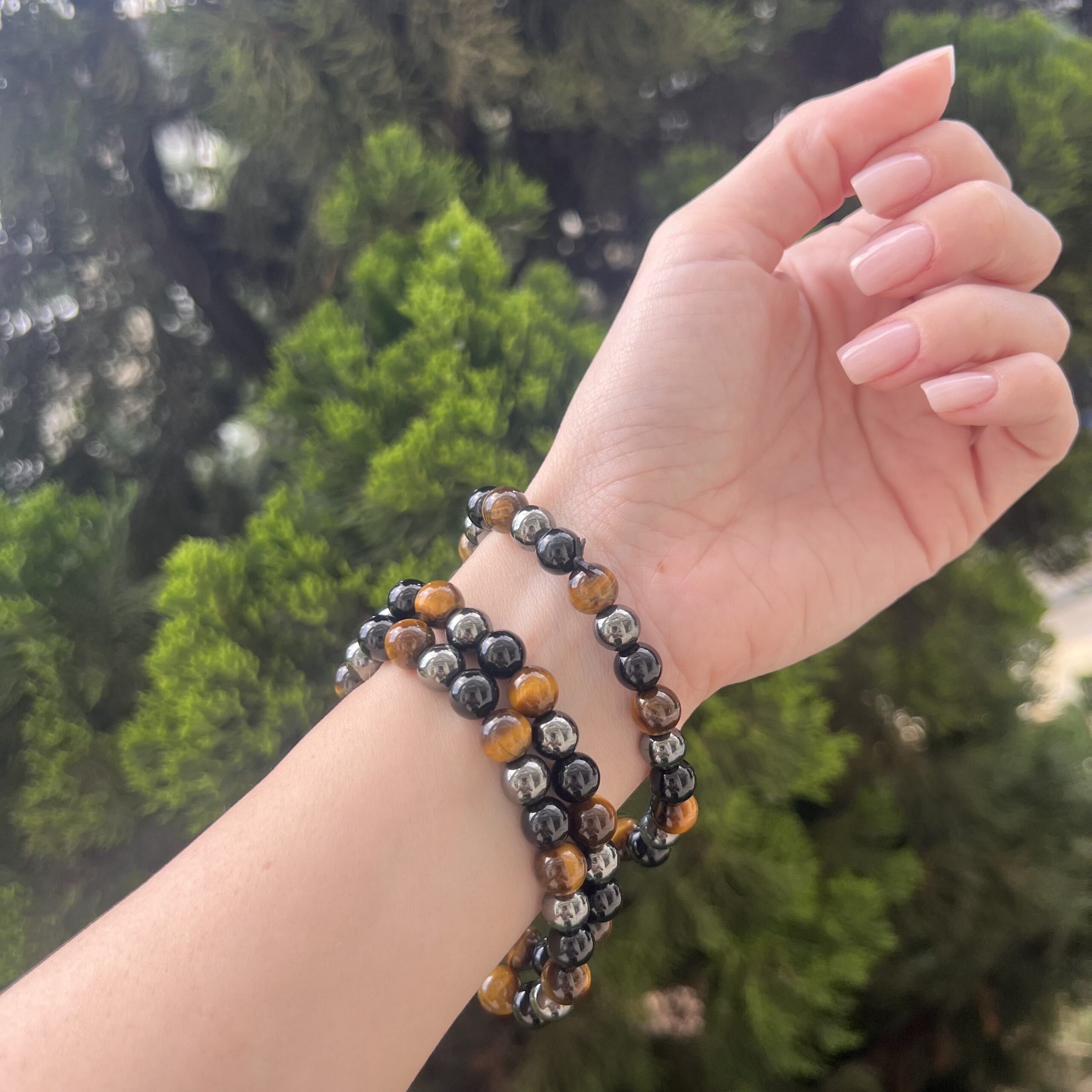 Trio de Pulseiras – Olho de Tigre, Hematita e Ágata Negra